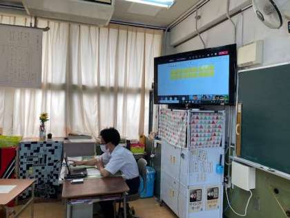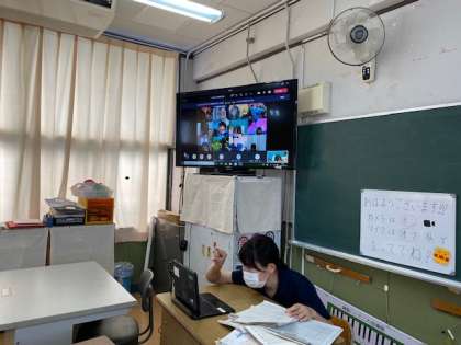 教室で先生は、画面の向こうの子どもたちと話ができました。