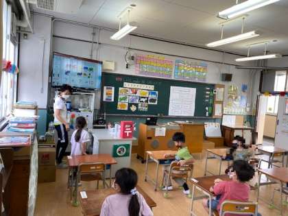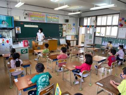 1年生は外国語活動で、数字や動物、色などを、曲に合わせて英語で歌っていました。