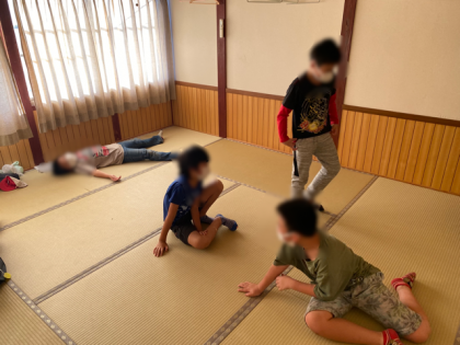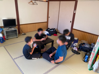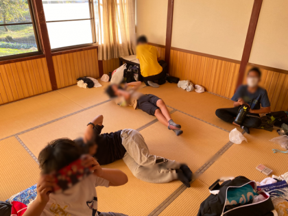 お風呂の時間です。入った人も、入る前の人も、部屋で楽しくカードゲームをしたり、キャンプファイヤーの係の練習をしたりして、ゆっくりとした時間を過ごしています。