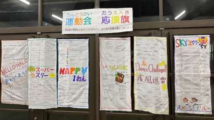 先日張り出した運動会の応援旗が、今朝には全学年の旗が張り出されていました。