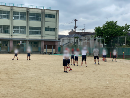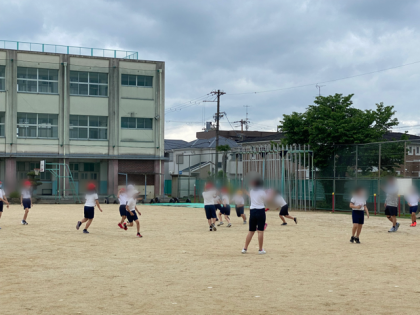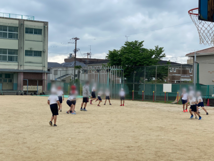 今年度の5年生の体育は、矢田中学校の体育の先生に授業を見ていただきます。スポーツテストに向けた運動をしています。