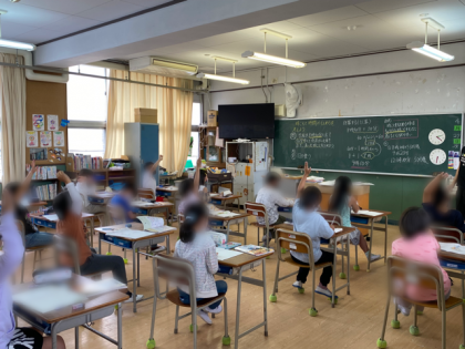 3年生は算数で、時計の学習です。わかったことを手をあげて発表しています。