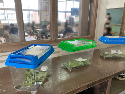教室の外には、理科で育てているモンシロチョウの幼虫がいます。サナギになっている様子も見られます。