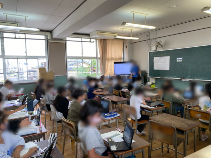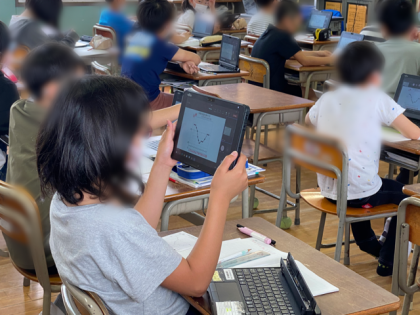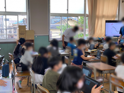 算数の学習をしています。一人一台パソコンを使って、グラフの学習に取り組んでいます。前の大型モニターのグラフが、子どもたちのパソコンにも映って、とてもわかりやすそうです。