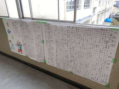 6年生の教室前廊下に、手作りで「大阪新聞」が貼られています。大阪の歴史というタイトルが見えますねぇ。学習したことをまとめています。