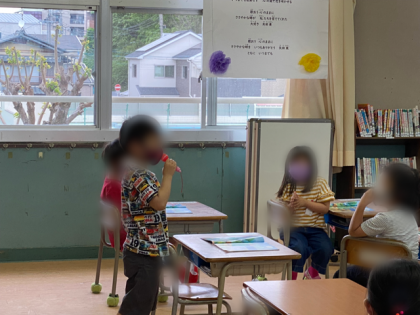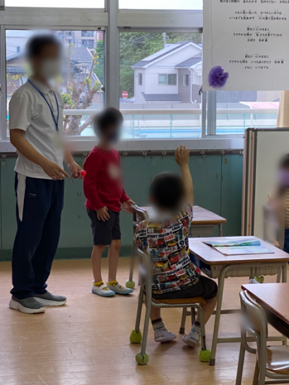 1年生の音楽では、教科書のイラストからわかった童謡(こいのぼり、めだかの学校など)を発表していました。わかった歌を歌って発表していました。とても楽しそうでした。まさに音楽(音を楽しむ学習)でした。