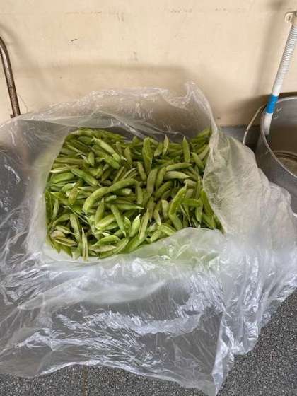 今日の献立にある「えんどう」は、調理員さんが一つずつ皮をむいてさやから出して調理してくれたものです。給食室前には、えんどうのさやが置いてありましたが、すごい数ですね。給食当番の子どもたちもびっくり。ありがたいですね。いただきます。
