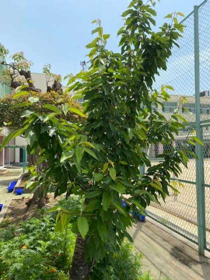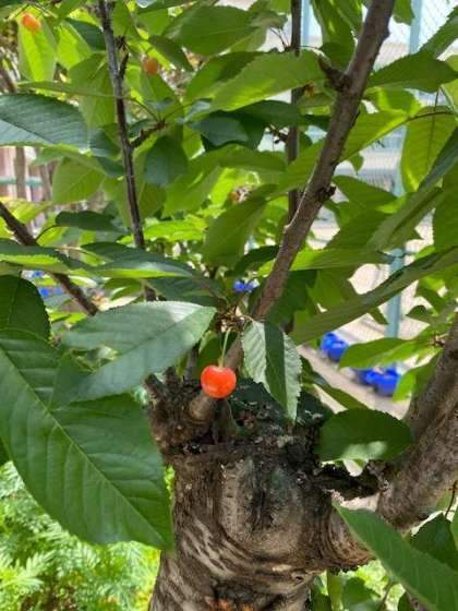 今年も職員室前の「さくらんぼの木」にさくらんぼが実りました。以前、大阪を直撃した台風で倒れてしまったこの木ですが、今は元気に元のようにさくらんぼの実をつけるようになりました。とても嬉しいです。