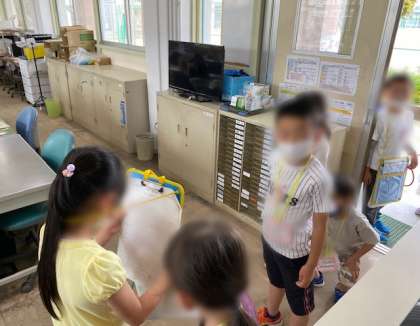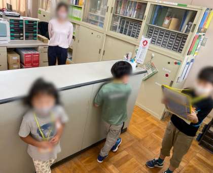 1年生が、2年生の「お兄ちゃん」「お姉ちゃん」に連れられて、学校のたくさんの教室を回りました。