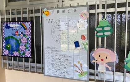 給食室前の掲示が、梅雨の季節バージョンになっています。季節の変化を感じられていいですね。