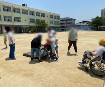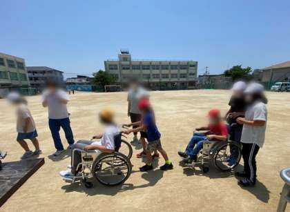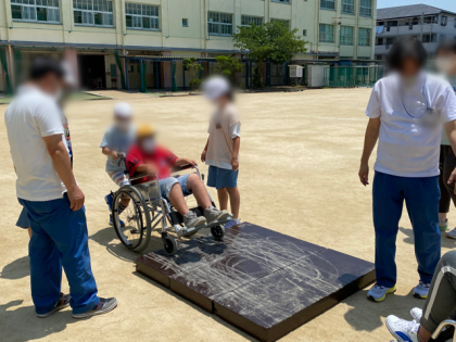 今日、5年生は区役所の方に来てもらって、車いす体験をしました。説明を聞いてから、運動場や廊下、段差の多いところから中庭を通る体験をしました。はじめての経験の子が多く、座るのも、押すのも「難しいなぁ」と言う声が多く聞かれました。