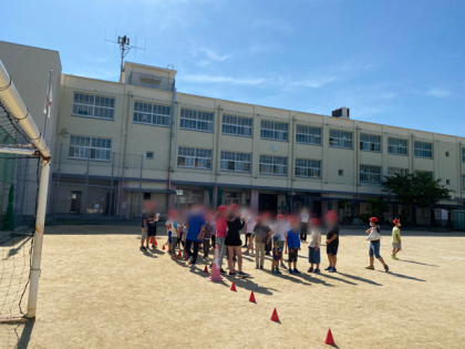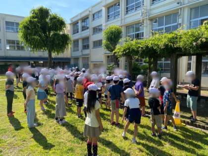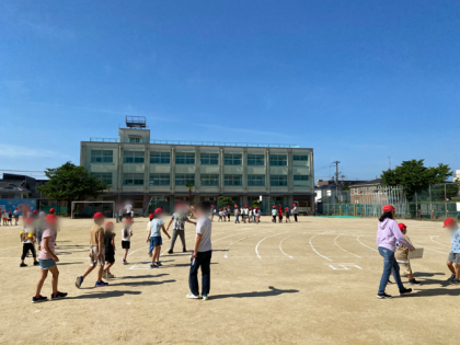 中庭と運動場に分かれて、なかよし班ごとに遊びます。