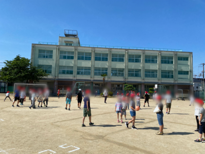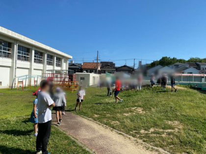 蜜を避けて、運動場と中庭に分かれて実施しました。
