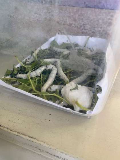 この蚕の幼虫が大きくなって・・・。どうなるのかな?