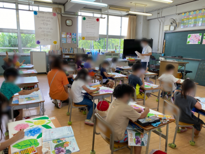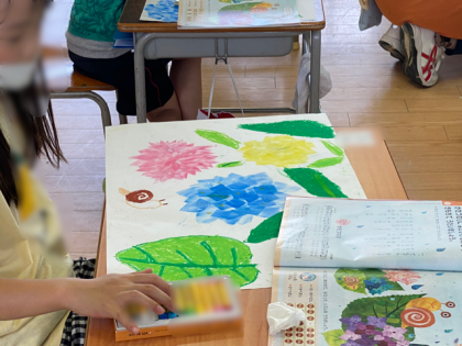 1年生は色鮮やかに、紫陽花、雨、カタツムリなど季節の絵画を描いています。
