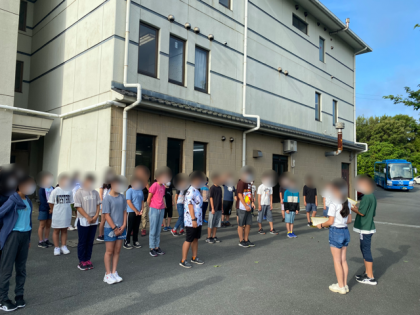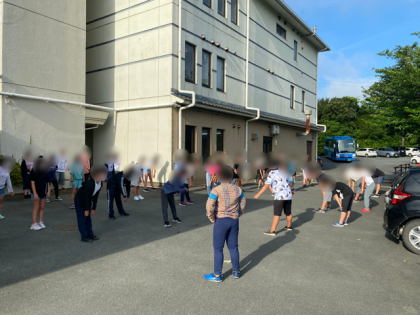 気持ちのいい朝です。風が少し強い感じですが、青空の下で朝の集いをしました。