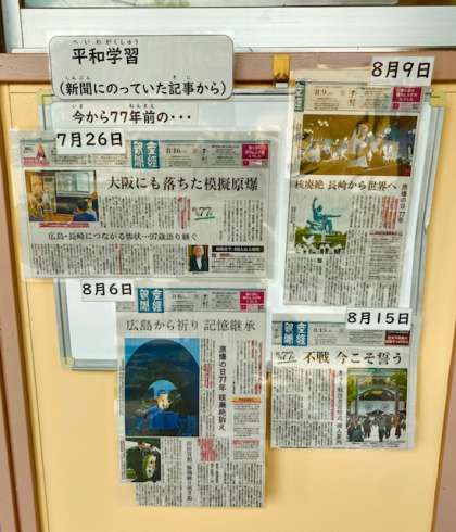 8月5日の平和登校日から、もう2週間後経ちます。この間に、これまで学習してきた日付が過ぎました。それぞれの日の新聞に、その関連の記事が出ていたので校長室前に掲示しました。また、ご覧になっていただけたらと思います。