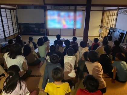 今日最後のプログラムは、ナイトハイクを予定していましたが、曇り空で星が見えません。残念ながら、プログラムを変更して広間で映画鑑賞をしました。