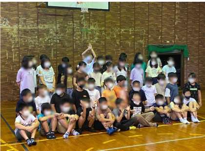 林間学習、このりんご狩りが最後のプログラムでした。少し雨が降っていましたが、無事終わりました。一人一つずつ採って、体育館で丸かじりしました。集合写真を撮りました。