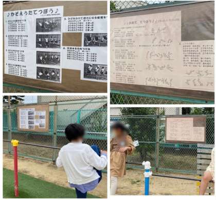 運動場の鉄棒近くには、「かぞえうたてつぼう」や「お歌でてつぼう」といった掲示をしました。