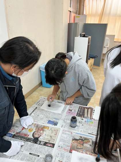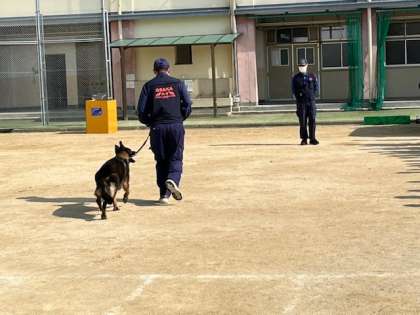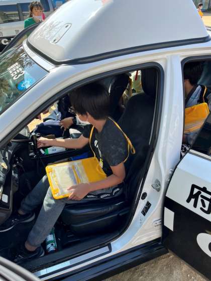 今回の出前授業では、大阪府警から警察官の方々に来ていただきました。パトカー・白バイ・制服警官だけではなく、なんと指紋などを調べる鑑識班、さらに警察犬まで来校しました。子どもたちは、パトカーや白バイの説明を聞いたり、実際に自分の指紋を調べたり、警察犬の実演をみたりと、充実した時間を過ごしたようです。本物にふれることにより、より具体的に警察という仕事を知ることができました。