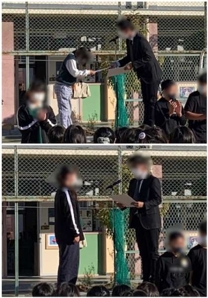 まずは児童の表彰からです。図工展で賞をもらった、3年生と6年生の2人からでした。