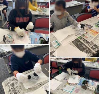 考古学体験では、実際に300年前ほどに発掘された瓦を版画のように版紙に写す、拓本(たくほん)という作業を体験しました。