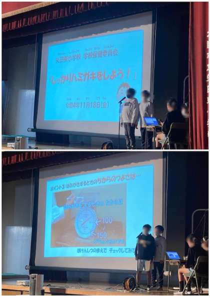 保健委員会の人が、歯みがきのしかたを丁寧にスライドや動画を使って説明してくれました。