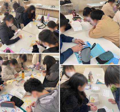 ドーナツの紙を切る人、材料のシールを貼る人、色をぬるのは手のすいた人から、などの役割分担や作業手順を決めて、ドーナツを作りました。