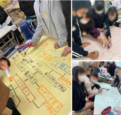 つづいて、食卓でドーナツを食べるまでに、材料を含めてどのような行程を経ているのか考えました。模造紙いっぱいに、関わってくる物、人、作業などが書きこまれました。