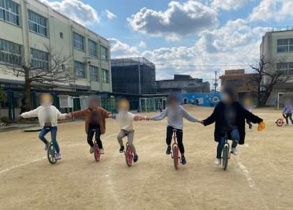 休み時間に運動場に出ていたら、後ろから「校長先生〜」と大きな声で呼ばれました。振り返ると、4年生が5人で手をつないで一輪車に乗っていました。あまりに上手で、ついパチリ。