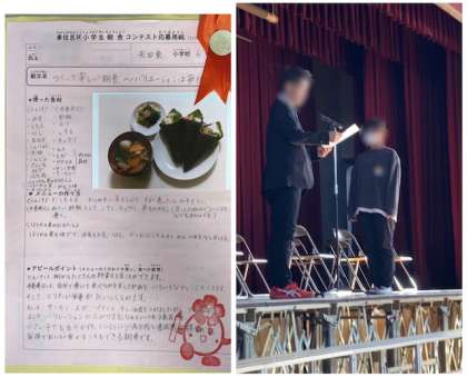 児童朝会の時に、6年生が表彰されました。「東住吉区 小学生朝食コンテスト」に応募して賞をとりました。