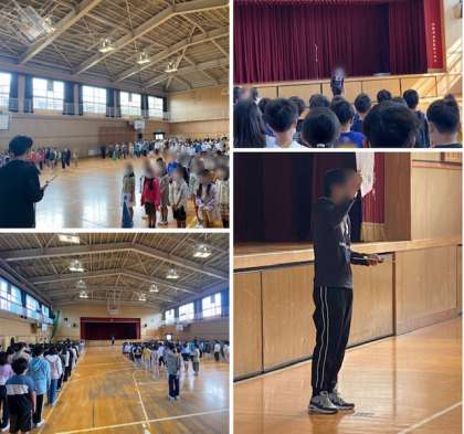 今朝は児童朝会がありました。運動場があめでぬかるんでいたので、体育館で行いました。1年生は金曜日の「1年生を迎える会」から一緒に並びます。ですから今朝は2〜6年生での朝会となりました。