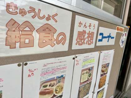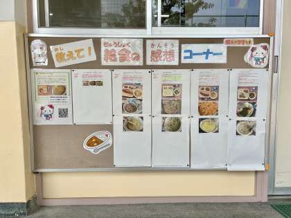 今年度から給食をより良いものにしていく為に、給食担当の職員が児童に喫食後の感想を聞き、それを学校HPに載せています。そしてその記事を「児童の給食感想コーナー」として職員室前に設置しました。