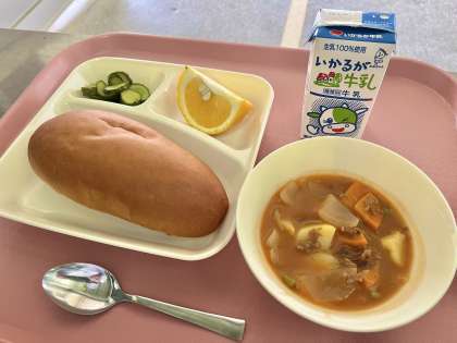 4月25日(月)の献立は「黒糖パン・牛乳・ビーフシチュー・きゅうりのサラダ・あまなつかん」でした。