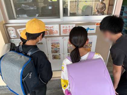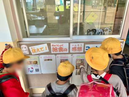 先週から職員室前廊下に設置した「教えて!給食感想コーナー」の様子です。児童の給食の感想を載せた給食HPを毎日掲示しています。自分の感想が載っている児童は、まじまじとHPの記事を読んでいました。