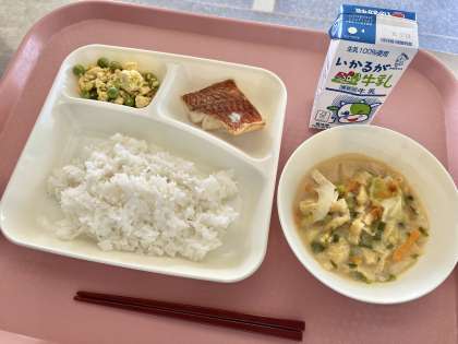 5月11日(木)の献立は「ごはん・牛乳・あかうおのしょうゆだれかけ・みそ汁・えんどうの卵とじ」でした。