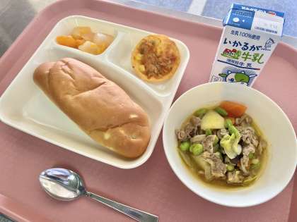 5月12日(金)の献立は「おさつパン・牛乳・豚肉と野菜のカレースープ煮・変わりピザ・ミックスフルーツ(缶)」でした。