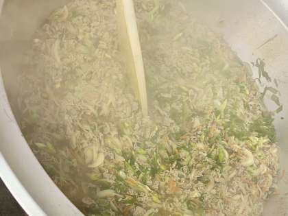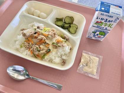 5月15日(月)の献立は「ごはん・牛乳・豚丼・きゅうりの梅風味・白玉だんごのきな粉がけ」でした。
