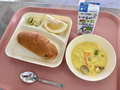 5月19日(金)の献立は「レーズンパン・牛乳・コーンクリームシチュー・キャベツときゅうりのサラダ・かわちばんかん」でした。