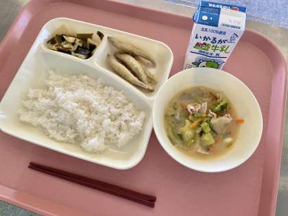 5月24日(水)の献立は「ごはん・牛乳・きびなごてんぷら・豚汁・わかたけ煮」でした。