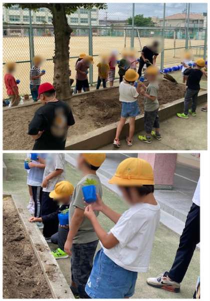 ホウセンカの苗を、職員室前の花壇に植えました。