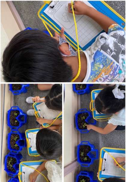1年生は、先週植えたアサガオの観察をしました。先週種を植えたのですが、もうふたばが顔を出しています。みんなしっかり観察していました。
