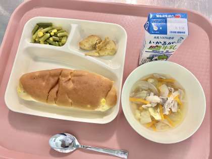 6月2日(金)の献立は「おさつパン・牛乳・鶏肉のカレー風味焼き・てぼ豆のスープ・さんどまめとコーンのサラダ」でした。