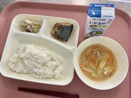 6月8日(木)の献立は「ごはん・牛乳・さごしのつけ焼き・みそ汁・キャベツの赤じそあえ」でした。