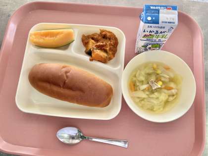 6月9日(金)の献立は「黒糖パン・牛乳・かぼちゃのミートグラタン・鶏肉と野菜のスープ・クインシーメロン」でした。