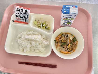 6月14日(水)の献立は「ごはん・牛乳・マーボーはるさめ・チンゲンサイともやしの甘酢あえ・いり黒豆」でした。