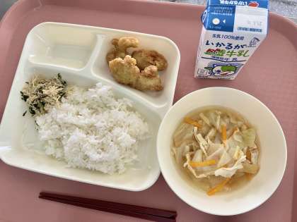 6月15日(木)の献立は「ごはん・牛乳・白身魚フリッター・すまし汁・とりなっ葉いため」でした。