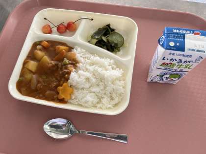 6月21日(水)の献立は「ハヤシライス・牛乳・ミックス海そうのサラダ・さくらんぼ」でした。