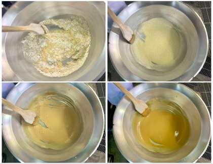 釜(ご家庭では鍋やフライパン)に綿実油を加え、中火で小麦粉が褐色になるまで十分にいためてルウを作ります。